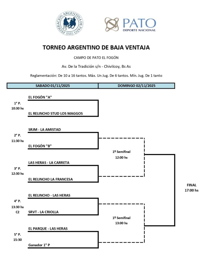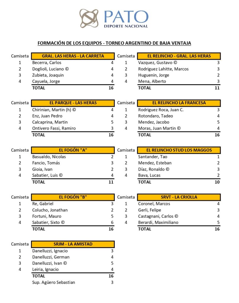 El Campo de Pato local tendrá dos representaciones, El Fogón A y B, mientras que El Relincho presentará 3 equipos: «La Francesa», «Stud Los Maggos» y el combinado con Gral. Las Heras.