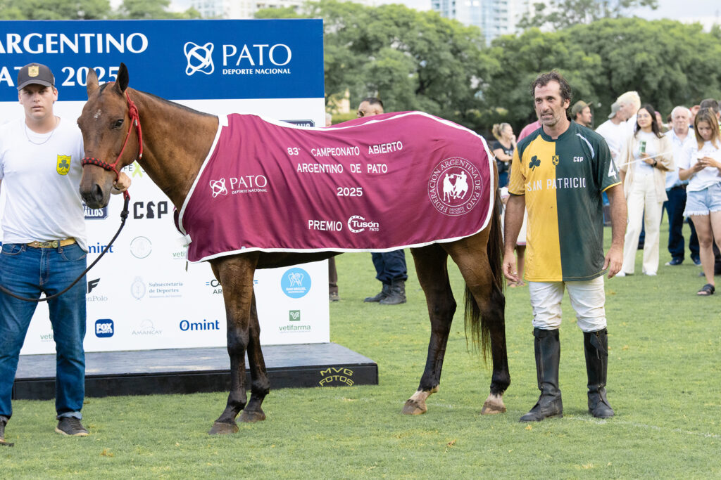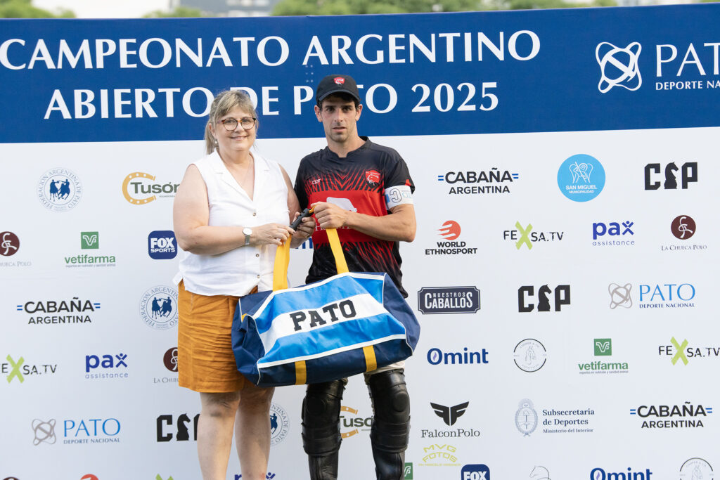 Con 37 tantos convertidos en el 83º Abierto Argentino de Pato, recibe de la mano de la Sra. Karen Femenías, Directora de TUSÓN INDUMENTARIA EQUINA un reconocimiento el Sr. Justo Bermúdez, capitán del equipo Campeón