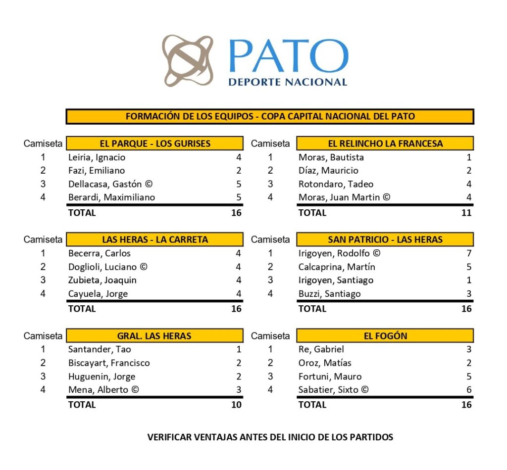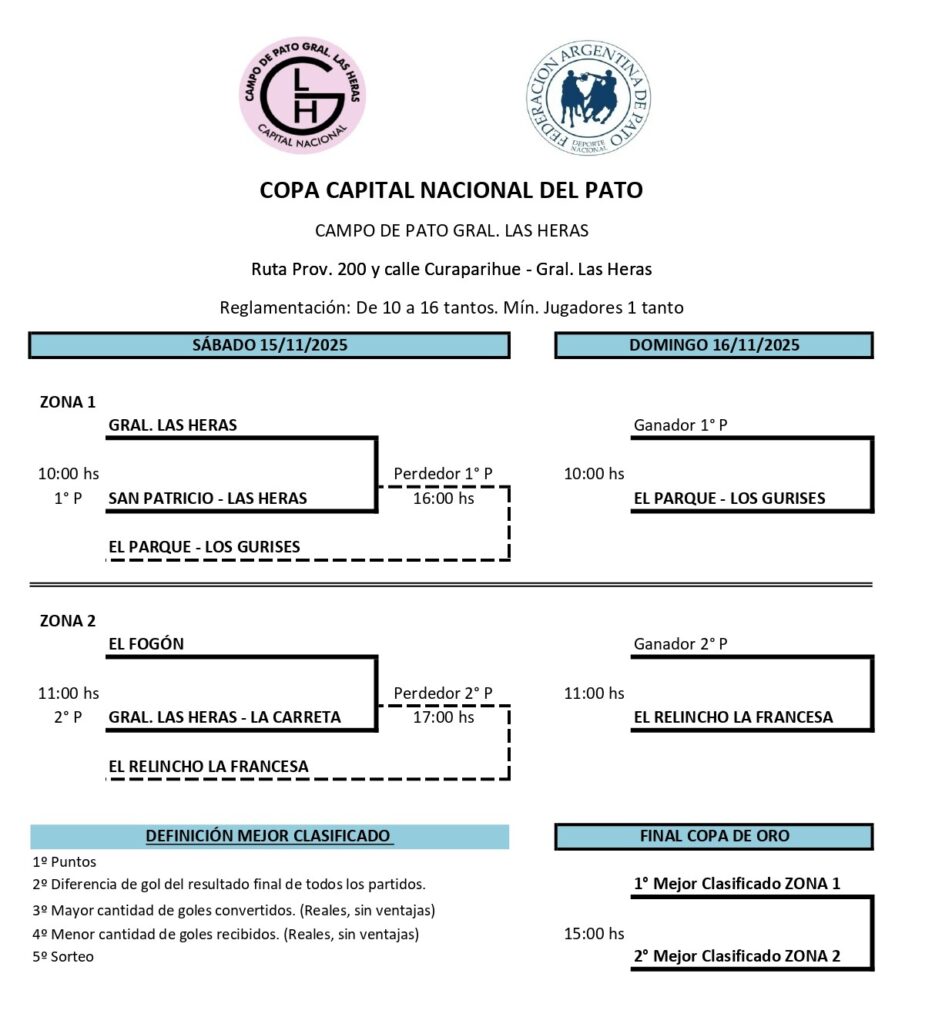 El Torneo Copa Capital estará conformado por 6 equipos con reglamentación hasta 16 tantos de ventaja. Participaran los conjuntos de: EL PARQUE – Los Gurises, EL FOGÓN, SAN PATRICIO LH, EL RELINCHO La Francesa y los conjuntos locales: GRAL. LAS HERAS y el combinado LAS HERAS – LA CARRETA.