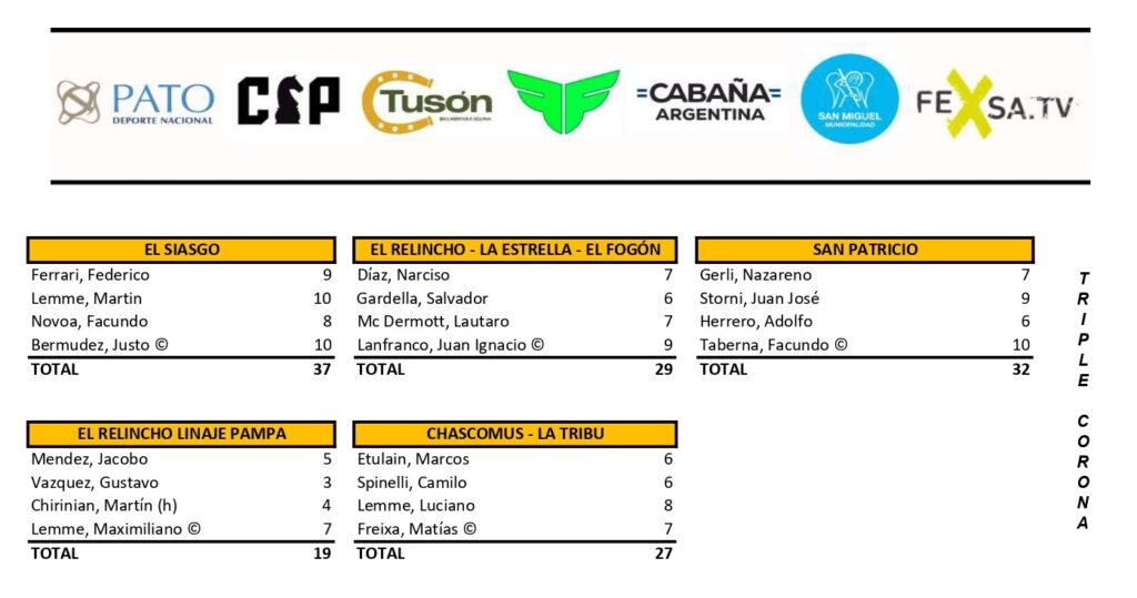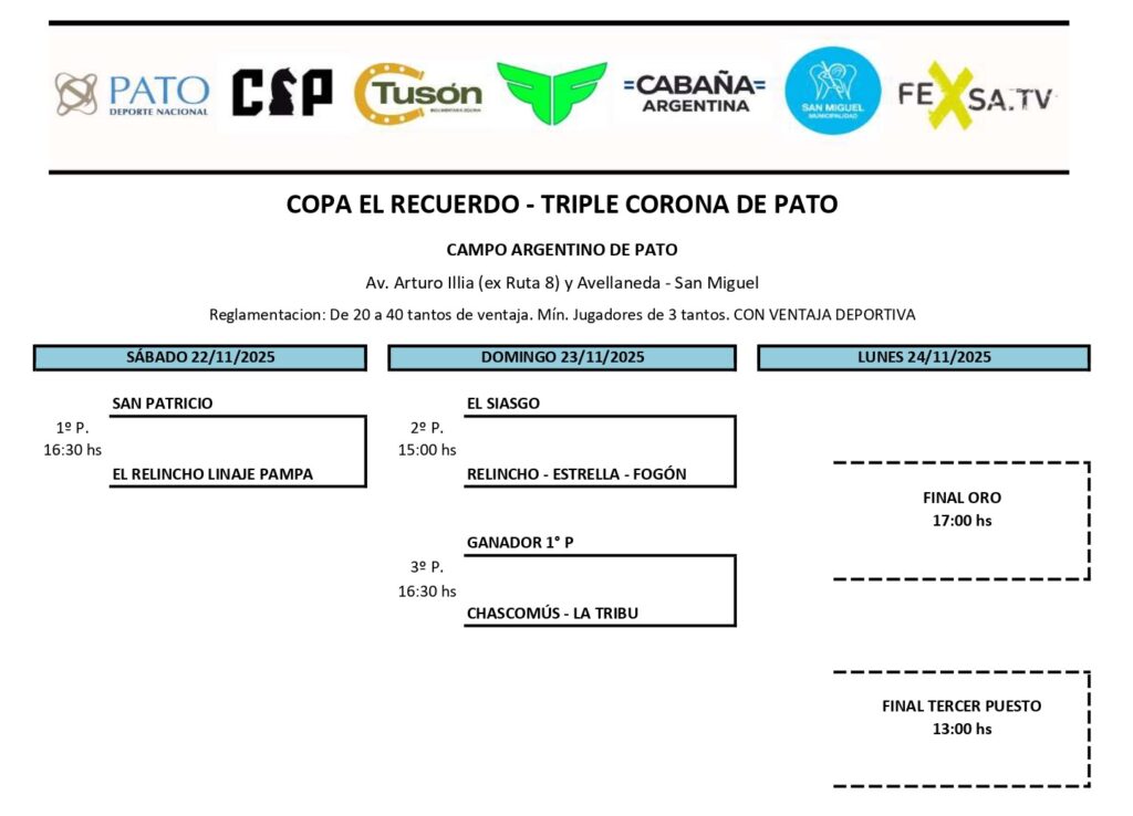 Aún tenemos pendiente la final de la Copa Argentina entre los equipos de San Patricio, liderado por Facundo Taberna y el equipo de Juan Ignacio Lanfranco, El Relincho – La Estrella – El Fogón. Se estima que el cruce definitorio sea durante las clasificaciones del Abierto Argentino de Pato.